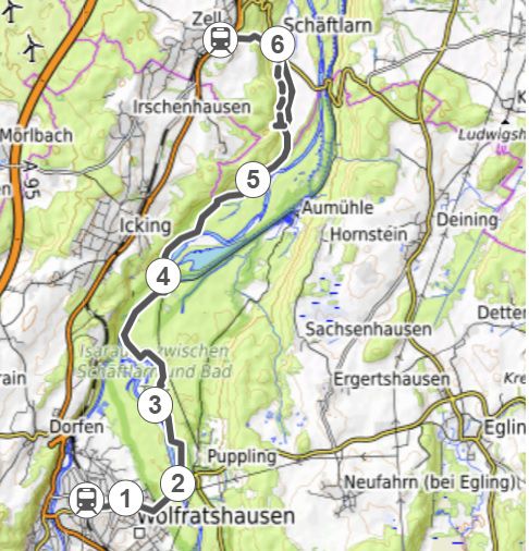 Von Wolfratshausen gehen wir zur Isarbrücke und von dort auf kleinen Wegen durch die Pupplinger Au. Vorbei am Ickinger Wehr wandern wir bis zum Kloster Schäftlarn. Von dort aus führt uns eine kleine "Berg-Etappe" rauf zum S-Bahnhof in Ebenhausen.